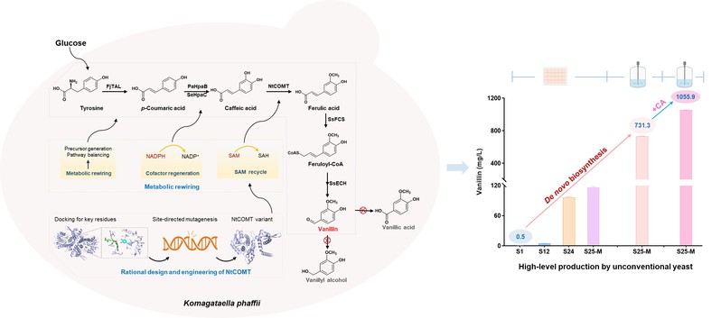 蔡孟浩课题组在非常规酵母从头生物合成香兰素方面取得重要进展。通过构建从头合成途径、阻断氧化还原转化、代谢途径与辅因子平衡、关键酶改造促进中间体转化等策略,实现迄今报道的香兰素从头生物合成最高产量,相关成果以“Metabolic and enzyme rewiring enables high-production of vanillin in unconventional yeast”为题,在线发表于《代谢工程》期刊 (Metabolic Engineering)。