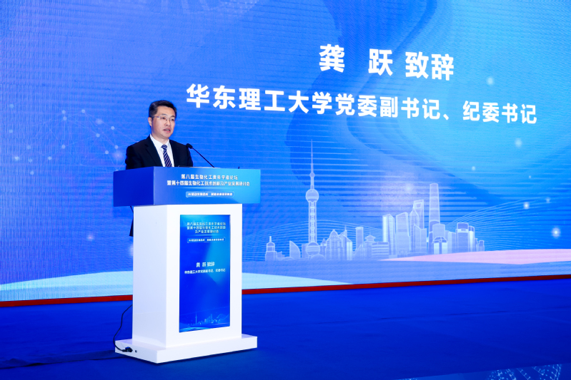 龚跃代表学校对与会嘉宾表示热烈欢迎。他指出,学校认真学习贯彻党的二十届四中全会精神,积极构建从基础研究到产业转化的全链条创新模式,持续推动传统化工优势与生物技术深度融合,在合成生物学等前沿领域加强有组织科研,着力打造具有全球影响力的生物制造创新高地。本次会议主题契合发展新质生产力的内在要求,充分展现了生物化工领域的创新方向。他诚邀各界学者以本次会议为契机,与华东理工大学深化合作,共同探索前沿科学问题,推动创新成果落地,为我国从“制造大国”迈向“智造强国”贡献力量。