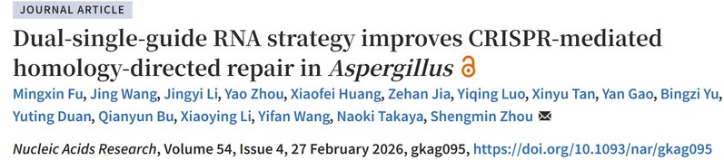 、生物反应器工程全国重点实验室周胜敏课题组在Nucleic Acids Research 发表题为“Dual-single-guide-RNA Strategy Improves CRISPR-Mediated Homology-Directed Repair in Aspergillus” 的研究论文。该研究系统阐明了限制CRISPR 精准敲入效率的关键 DNA 修复机制,并提出了一种具有普适性的高效 HDR 设计策略,为基因编辑中插入位点依赖性强、目标片段难以高效敲入这一普遍问题,提供了可预测、可推广的解决方案。