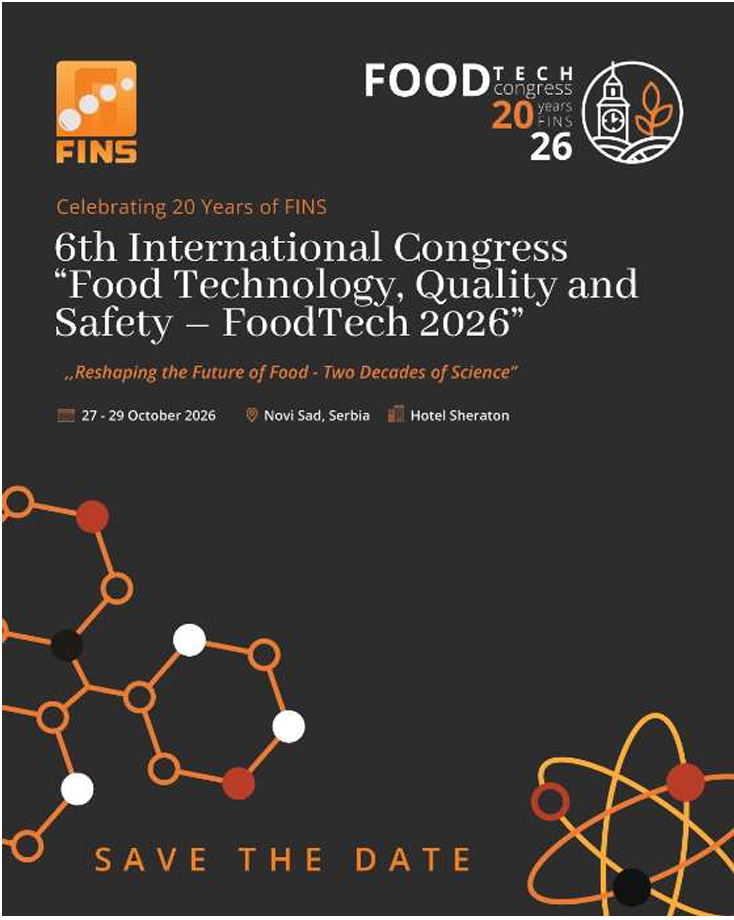 由塞尔维亚诺维萨大学食品科技研究所(FINS)主办,华东理工大学、塞尔维亚贝尔格莱德肉类卫生与技术研究所(INMES)共同主办的第六届“食品技术、质量与安全”国际会议(The 6th International Congress “Food Technology, Quality and Safety–FoodTech 2026”)将于2026年10月27日至29日在塞尔维亚诺维萨德举办。